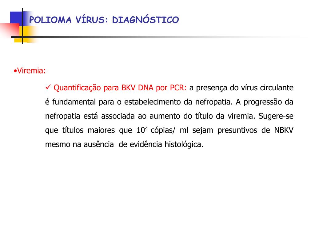 POLIOMA VÍRUS: DIAGNÓSTICO • Viremia: • Quantificação para BKV DNA por PCR: a presença do vírus circulante é fundamental para o estabelecimento da nefropatia. A progressão da nefropatia está associada ao aumento do título da viremia. Sugere-se que títulos maiores que 104 cópias/ ml sejam presuntivos de NBKV mesmo na ausência de evidência histológica.