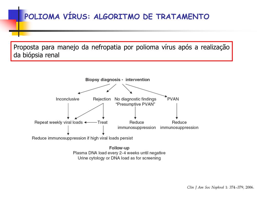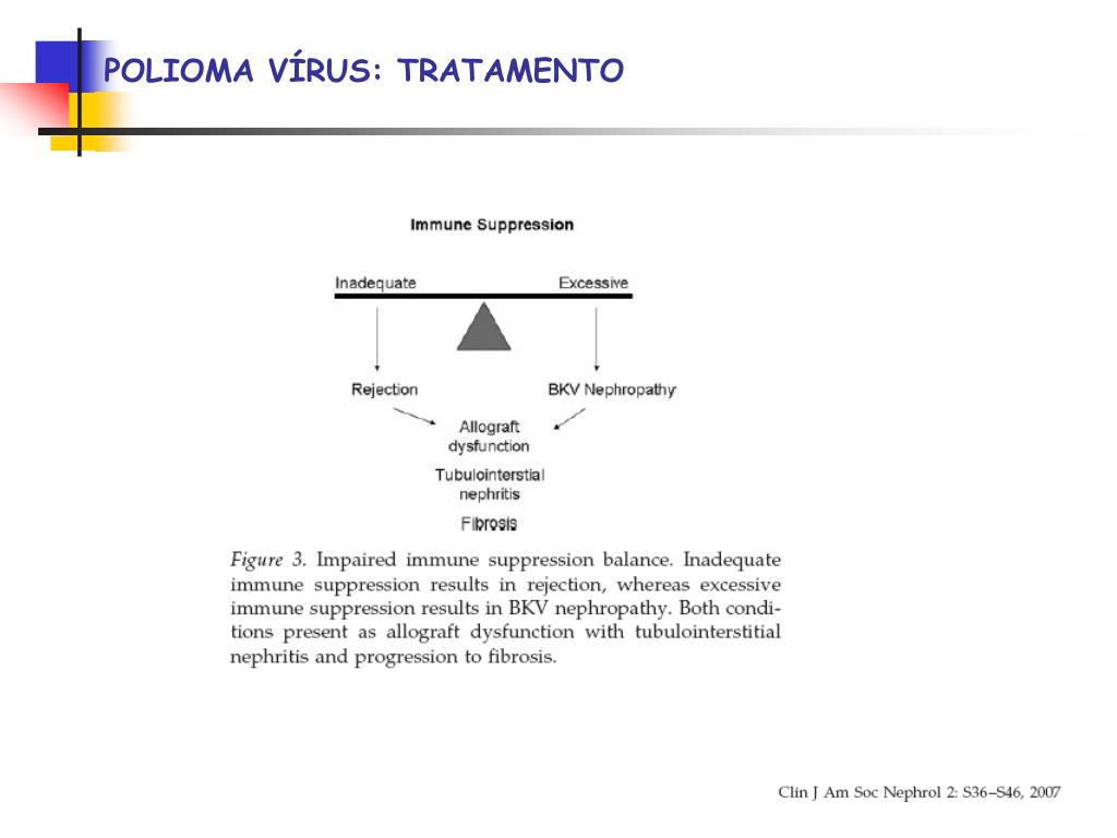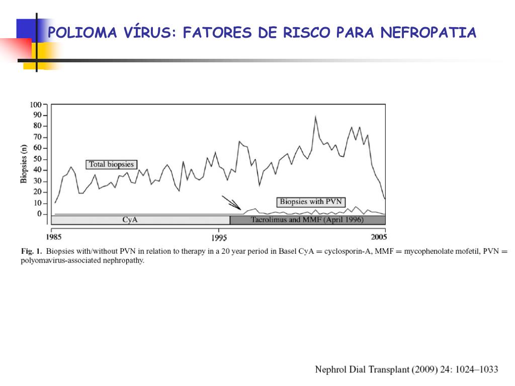 POLIOMA VÍRUS: TRATAMENTO Autor realizou biópsias renais de vigilância: nos casos confirmados de nefropatia por BKV a creatinina permaneceu estável e o número de túbulos com BK positivo nas biópsias de seguimento diminuiram após a redução no micofenolato e redução ou conversão do tacrolimus para ciclosporina.