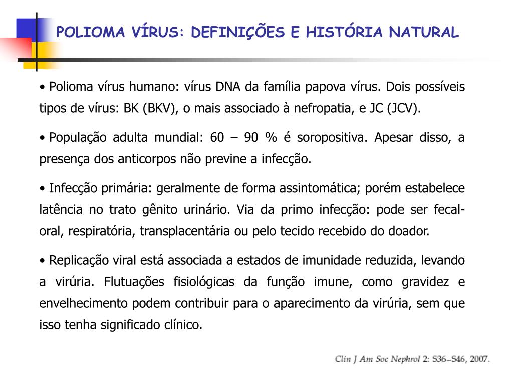 POLIOMA VÍRUS: DEFINIÇÕES E HISTÓRIA NATURAL • Polioma vírus humano: vírus DNA da família papova vírus. Dois possíveis tipos de vírus: BK (BKV), o mais associado à nefropatia, e JC (JCV). • População adulta mundial: 60 – 90 % é soropositiva. Apesar disso, a presença dos anticorpos não previne a infecção. • Infecção primária: geralmente de forma assintomática; porém estabelece latência no trato gênito urinário. Via da primo infecção: pode ser fecal-oral, respiratória, transplacentária ou pelo tecido recebido do doador. • Replicação viral está associada a estados de imunidade reduzida, levando a virúria. Flutuações fisiológicas da função imune, como gravidez e envelhecimento podem contribuir para o aparecimento da virúria, sem que isso tenha significado clínico.