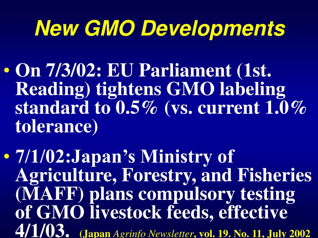 New GMO Developments • On 7/3/02: EU Parliament (1st. Reading) tightens GMO labeling standard to 0.5% (vs. current 1.0% tolerance) • 7/1/02:Japan’s Ministry of Agriculture, Forestry, and Fisheries (MAFF) plans compulsory testing of GMO livestock feeds, effective 4/1/03. (Japan Agrinfo Newsletter, vol. 19. No. 11, July 2002