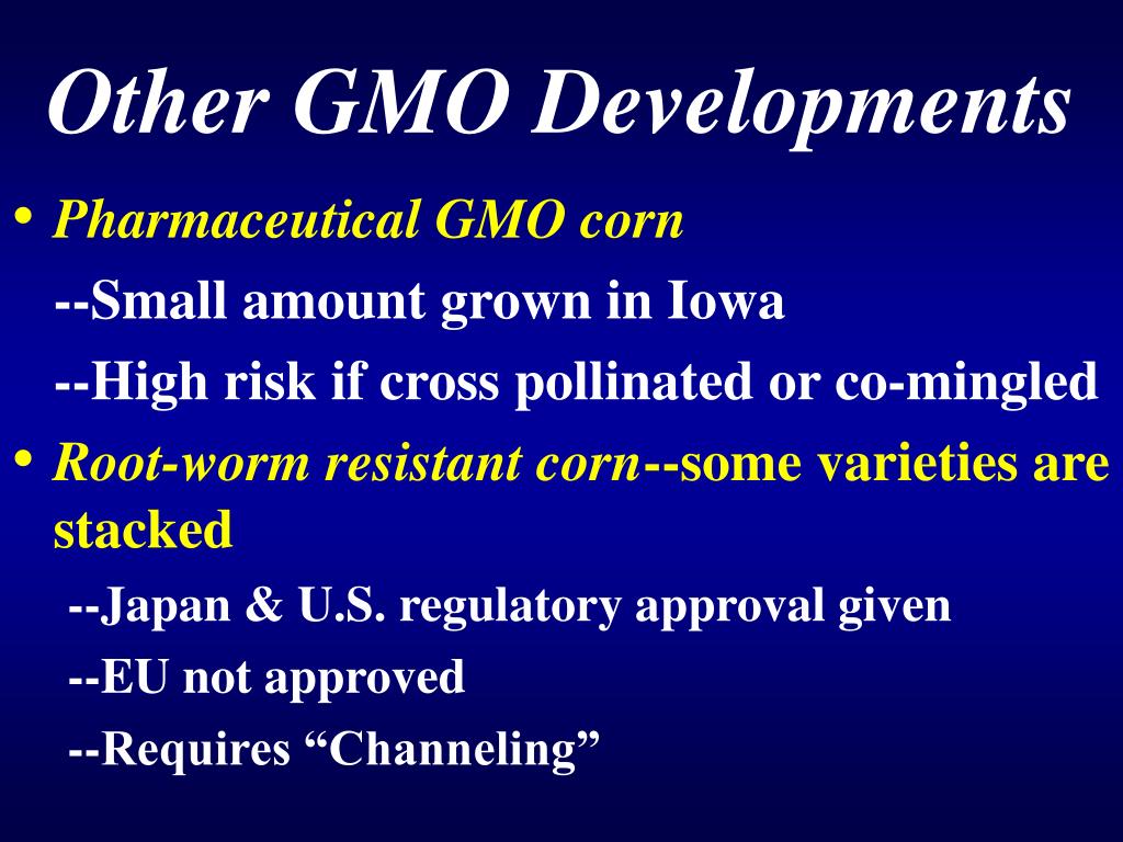 Other GMO Developments • Pharmaceutical GMO corn --Small amount grown in Iowa --High risk if cross pollinated or co-mingled • Root-worm resistant corn--some varieties are stacked --Japan & U.S. regulatory approval given --EU not approved --Requires “Channeling”