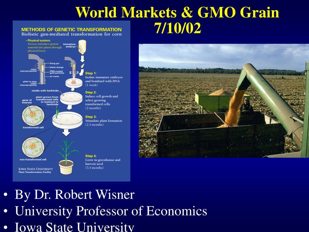 World Markets & GMO Grain. 7/10/02. •. By Dr. Robert Wisner. •. University Professor of Economics. •. Iowa State University. GMO World Marketing Issues. Issue is not “Are GMO Crops Safe?” Real Issue: “What do our customers think of GMO food? Do they want it?”