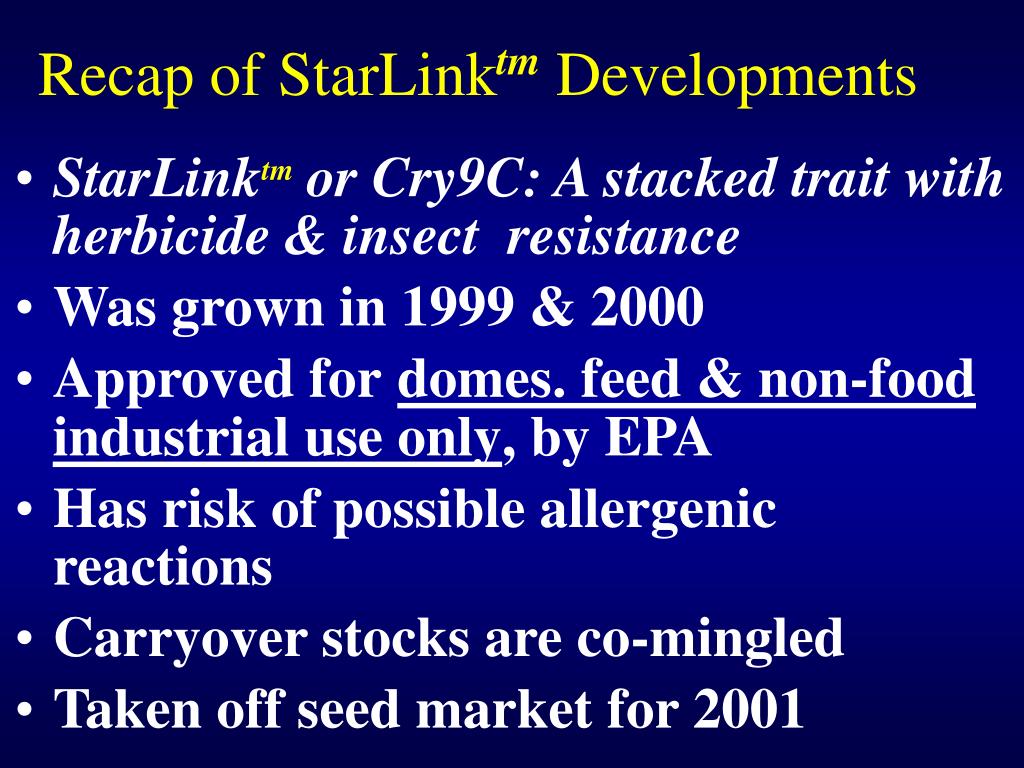 Recap of StarLink tm Developments • StarLink or Cry9C: A stacked trait with tm herbicide & insect resistance • Was grown in 1999 & 2000 • Approved for domes. feed & non-food industrial use only , by EPA • Has risk of possible allergenic reactions • Carryover stocks are co-mingled • Taken off seed market for 2001