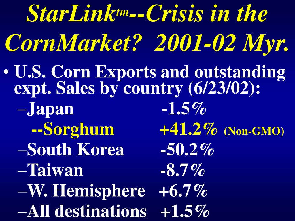 StarLinktm--Crisis in the CornMarket? 2001-02 Myr. • U.S. Corn Exports and outstanding expt. Sales by country (6/23/02): • Japan -1.5% --Sorghum +41.2% (Non-GMO) • South Korea -50.2% • Taiwan -8.7% • W. Hemisphere +6.7% • All destinations +1.5%