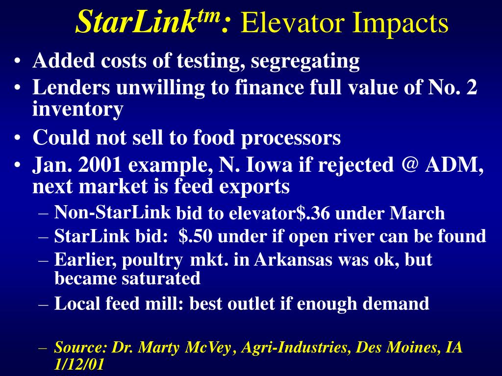 StarLinktm: Elevator Impacts • Added costs of testing, segregating • Lenders unwilling to finance full value of No. 2 inventory • Could not sell to food processors • Jan. 2001 example, N. Iowa if rejected @ ADM, next market is feed exports Non- StarLink – bid to elevator$.36 under March StarLink bid: $.50 under if open river can be found – Earlier, poultry mkt . in Arkansas was ok, but – became saturated Local feed mill: best outlet if enough demand – Source: Dr. Marty McVey , Agri -Industries, Des Moines, IA – 1/12/01