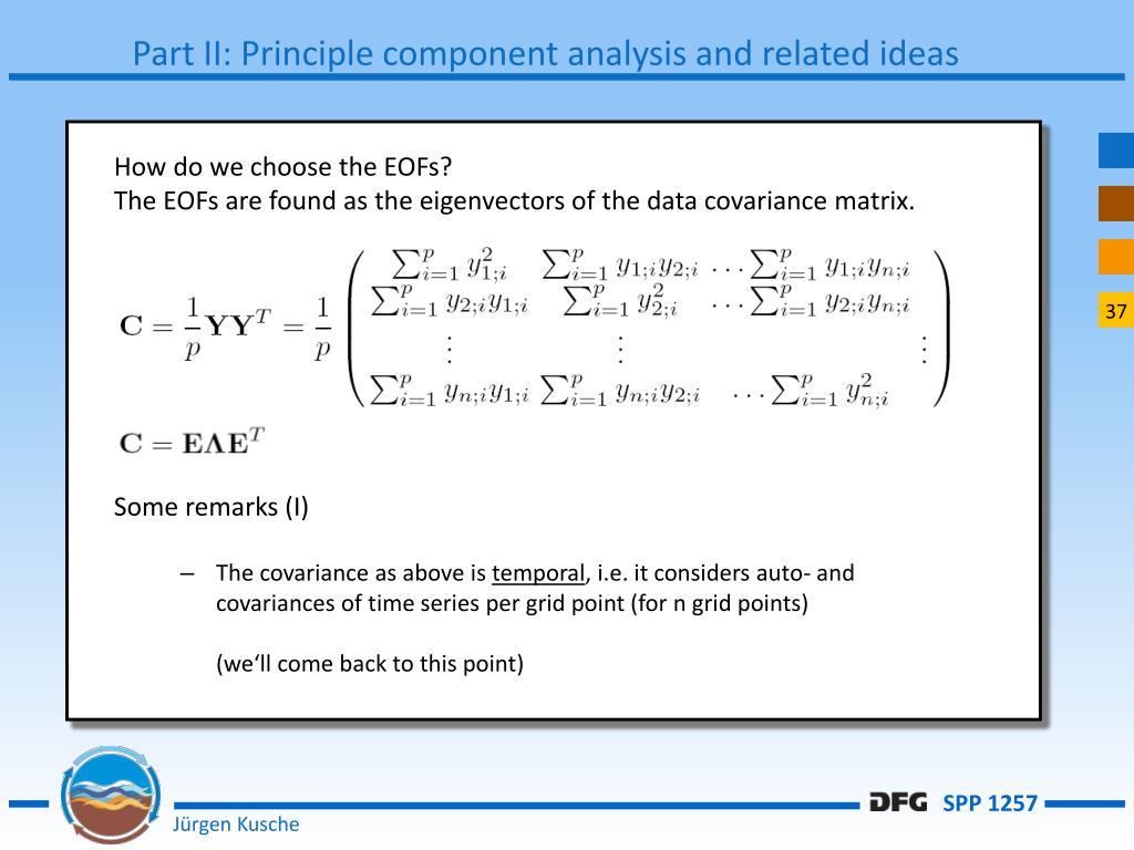 Part II: Principle component analysis and related ideas How do we choose the EOFs? The EOFs are found as the eigenvectors of the data covariance matrix. Some remarks (I) • The covariance as above is temporal, i.e. it considers auto- and covariances of time series per grid point (for n grid points) (we‘ll come back to this point)
