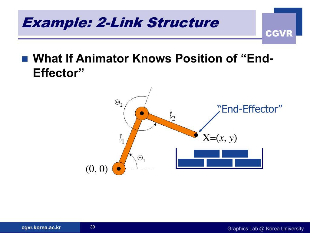 Example: 2-Link Structure • What If Animator Knows Position of “End-Effector” “End-Effector” X=(x, y) (0, 0) cgvr.korea.ac.kr