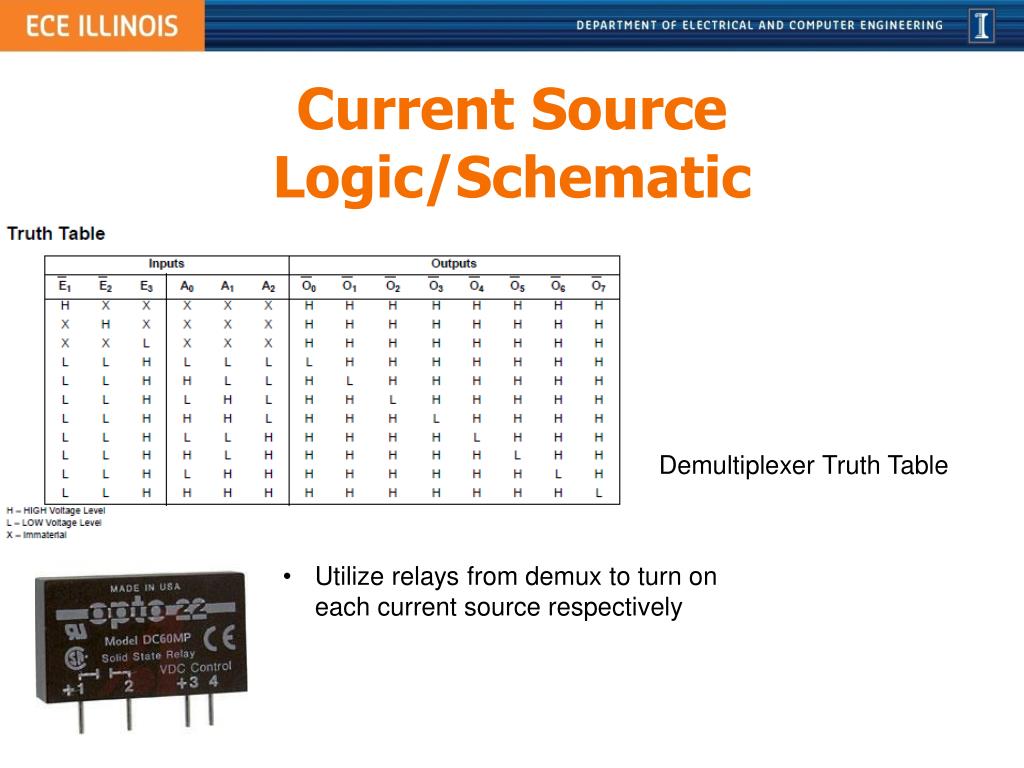 Current Source Logic/Schematic • Demultiplexer Truth Table • Utilize relays from demux to turn on each current source respectively