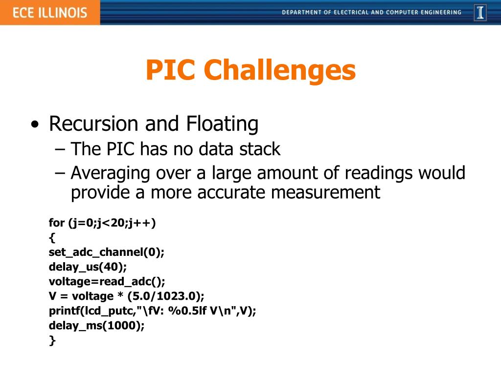 PIC Challenges • Recursion and Floating • The PIC has no data stack • Averaging over a large amount of readings would provide a more accurate measurement for (j=0;j<20;j++) { set_adc_channel(0); delay_us(40); voltage=read_adc(); V = voltage * (5.0/1023.0); printf(lcd_putc,"\fV: %0.5lf V\n",V); delay_ms(1000); }