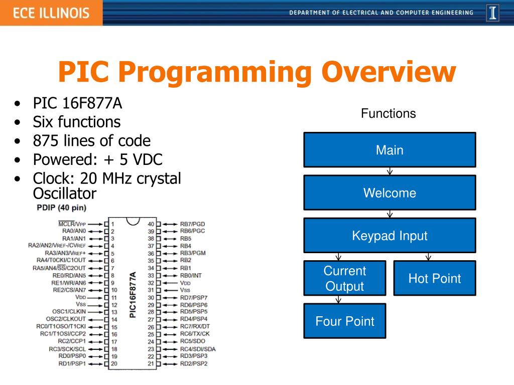 PIC Programming Overview Functions • PIC 16F877A • Six functions • 875 lines of code • Powered: + 5 VDC • Clock: 20 MHz crystal Oscillator Main Welcome Keypad Input Current Output Hot Point Four Point