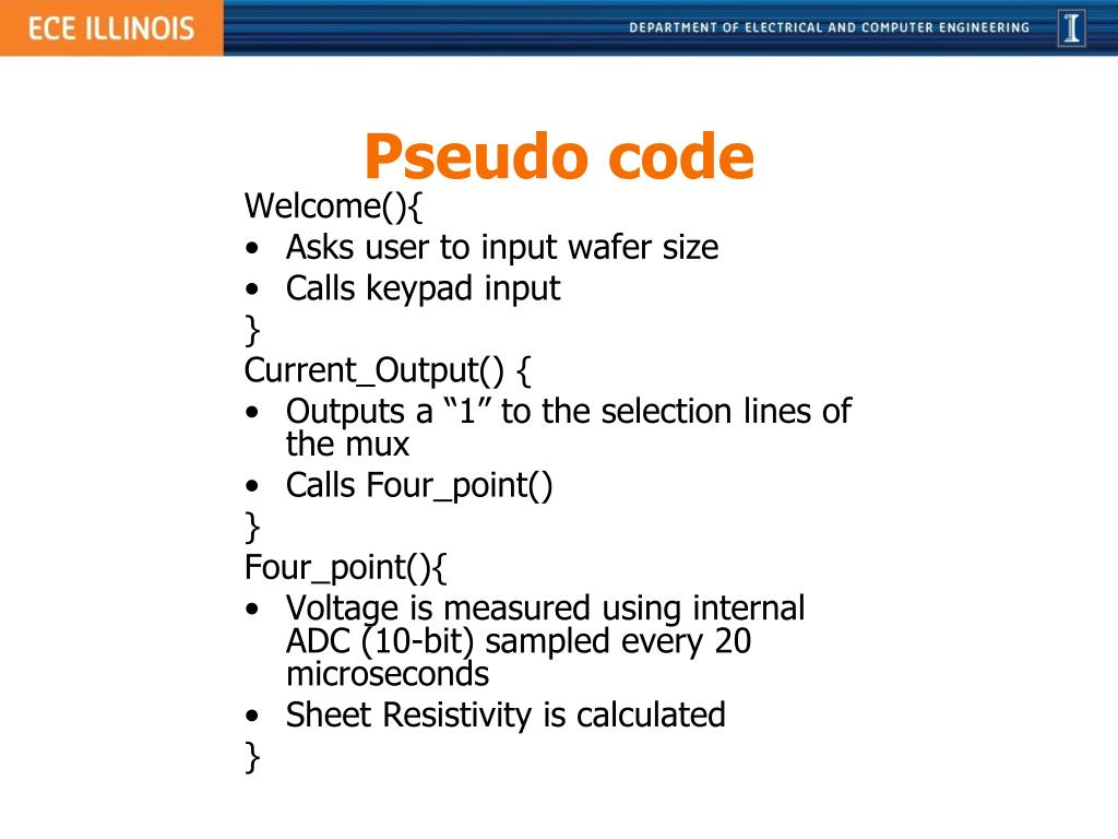 Pseudo code Welcome(){ • Asks user to input wafer size • Calls keypad input } Current_Output() { • Outputs a “1” to the selection lines of the mux • Calls Four_point() } Four_point(){ • Voltage is measured using internal ADC (10-bit) sampled every 20 microseconds • Sheet Resistivity is calculated }