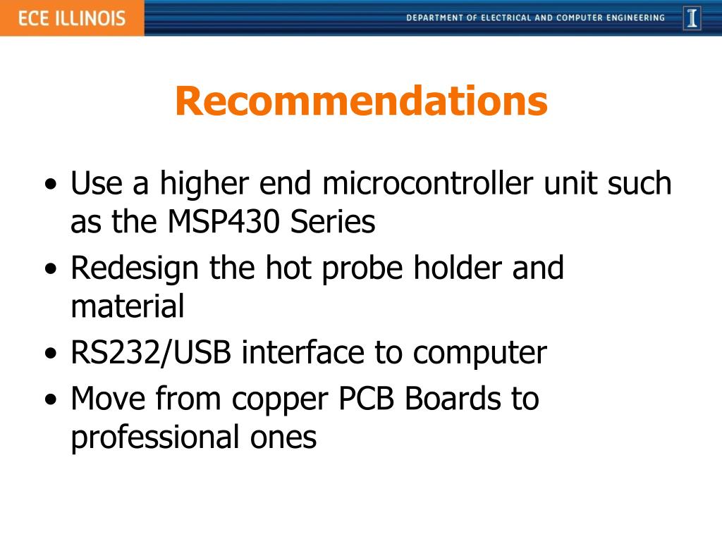 Recommendations • Use a higher end microcontroller unit such as the MSP430 Series • Redesign the hot probe holder and material • RS232/USB interface to computer • Move from copper PCB Boards to professional ones