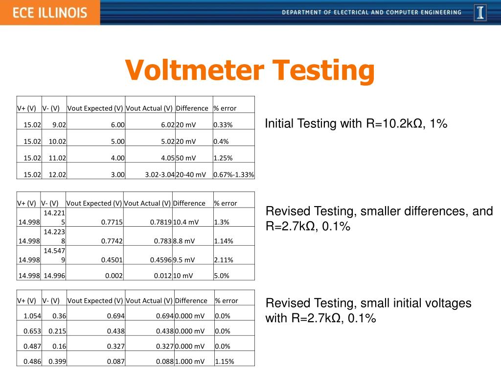 Voltmeter Testing Initial Testing with R=10.2kΩ, 1% Revised Testing, smaller differences, and R=2.7kΩ, 0.1% Revised Testing, small initial voltages with R=2.7kΩ, 0.1%