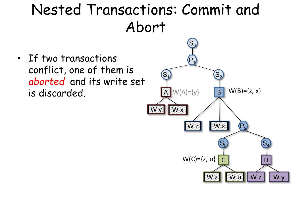Nested Transactions: Commit and Abort S0 • If two transactions conflict, one of them is aborted and its write set is discarded. P1 S1 S2 W(B)={z, x} W(A)={y} A B W y W x W z W x P2 S3 S4 W(C)={z, u} C D W z W u W z W y