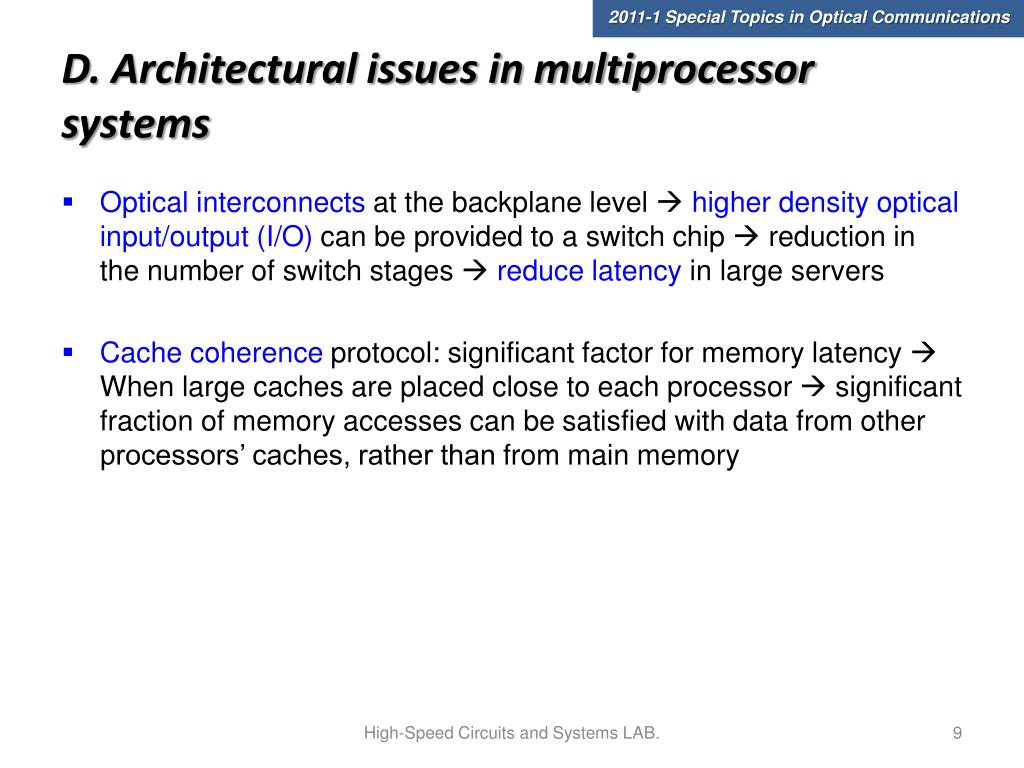 2011-1 Special Topics in Optical Communications D. Architectural issues in multiprocessor systems • To increase the size of a, switches are inserted in the path to accommodate additional point-to-point connections. Drawback: significant latency (additional switch stages) High-Speed Circuits and Systems LAB.