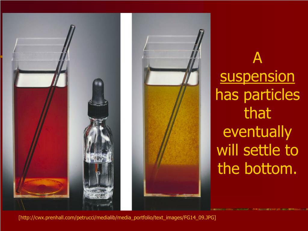 A suspension has particles that eventually will settle to the bottom. [http://cwx.prenhall.com/petrucci/medialib/media_portfolio/text_images/FG14_09.JPG]