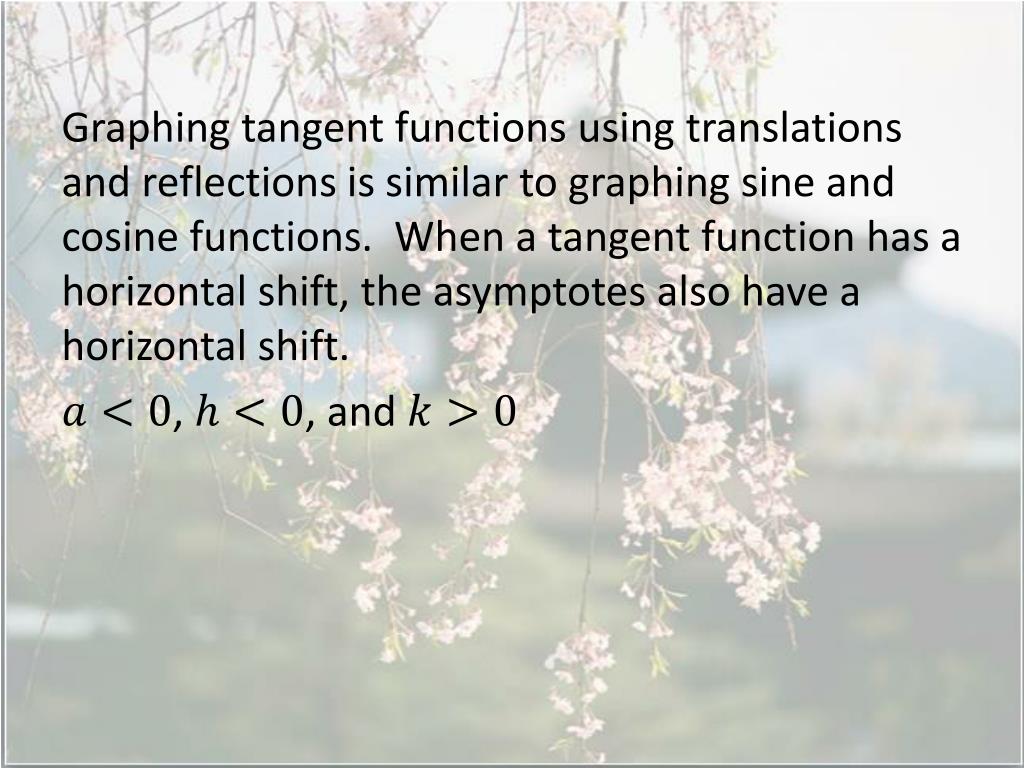 Graphing tangent functions using translations and reflections is similar to graphing sine and cosine functions. When a tangent function has a horizontal shift, the asymptotes also have a horizontal shift. , , and