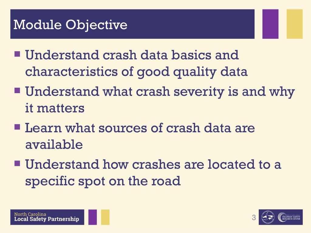 Module Objective Understand crash data basics and characteristics of good quality data Understand what crash severity is and why it matters Learn what sources of crash data are available Understand how crashes are located to a specific spot on the road