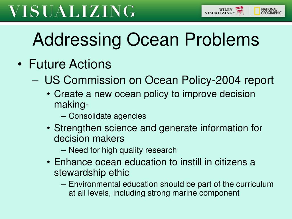 Addressing Ocean Problems • Learning Objectives: • Describe international initiatives that address problems in the global ocean • Explain goals associated with correcting ocean problems in the future
