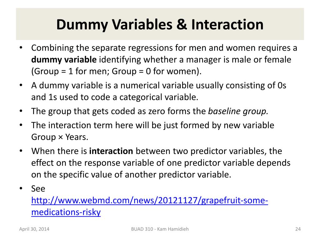 Dummy Variables & Interaction • Combining the separate regressions for men and women requires a dummy variable identifying whether a manager is male or female (Group = 1 for men; Group = 0 for women). • A dummy variable is a numerical variable usually consisting of 0s and 1s used to code a categorical variable. • The group that gets coded as zero forms the baseline group. • The interaction term here will be just formed by new variable Group × Years. • When there is interaction between two predictor variables, the effect on the response variable of one predictor variable depends on the specific value of another predictor variable. • Seehttp://www.webmd.com/news/20121127/grapefruit-some-medications-risky BUAD 310 - Kam Hamidieh