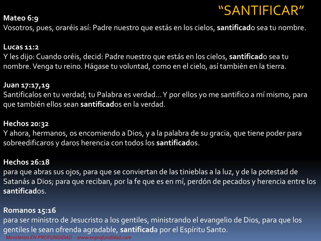 “SANTIFICAR” Mateo 6:9Vosotros, pues, oraréis así: Padre nuestro que estás en los cielos, santificado sea tu nombre. Lucas 11:2Y les dijo: Cuando oréis, decid: Padre nuestro que estás en los cielos, santificado sea tu nombre. Venga tu reino. Hágase tu voluntad, como en el cielo, así también en la tierra. Juan 17:17,19Santificalos en tu verdad; tu Palabra es verdad… Y por ellos yo me santifico a mí mismo, para que también ellos sean santificados en la verdad. Hechos 20:32Y ahora, hermanos, os encomiendo a Dios, y a la palabra de su gracia, que tiene poder para sobreedificaros y daros herencia con todos los santificados. Hechos 26:18para que abras sus ojos, para que se conviertan de las tinieblas a la luz, y de la potestad de Satanás a Dios; para que reciban, por la fe que es en mí, perdón de pecados y herencia entre los santificados. Romanos 15:16para ser ministro de Jesucristo a los gentiles, ministrando el evangelio de Dios, para que los gentiles le sean ofrenda agradable, santificada por el Espíritu Santo.