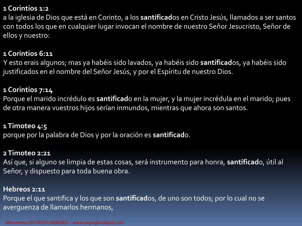1 Corintios 1:2a la iglesia de Dios que está en Corinto, a los santificados en Cristo Jesús, llamados a ser santos con todos los que en cualquier lugar invocan el nombre de nuestro Señor Jesucristo, Señor de ellos y nuestro: 1 Corintios 6:11Y esto erais algunos; mas ya habéis sido lavados, ya habéis sido santificados, ya habéis sido justificados en el nombre del Señor Jesús, y por el Espíritu de nuestro Dios. 1 Corintios 7:14Porque el marido incrédulo es santificado en la mujer, y la mujer incrédula en el marido; pues de otra manera vuestros hijos serían inmundos, mientras que ahora son santos. 1 Timoteo 4:5porque por la palabra de Dios y por la oración es santificado. 2 Timoteo 2:21Así que, si alguno se limpia de estas cosas, será instrumento para honra, santificado, útil al Señor, y dispuesto para toda buena obra. Hebreos 2:11Porque el que santifica y los que son santificados, de uno son todos; por lo cual no se averguenza de llamarlos hermanos,