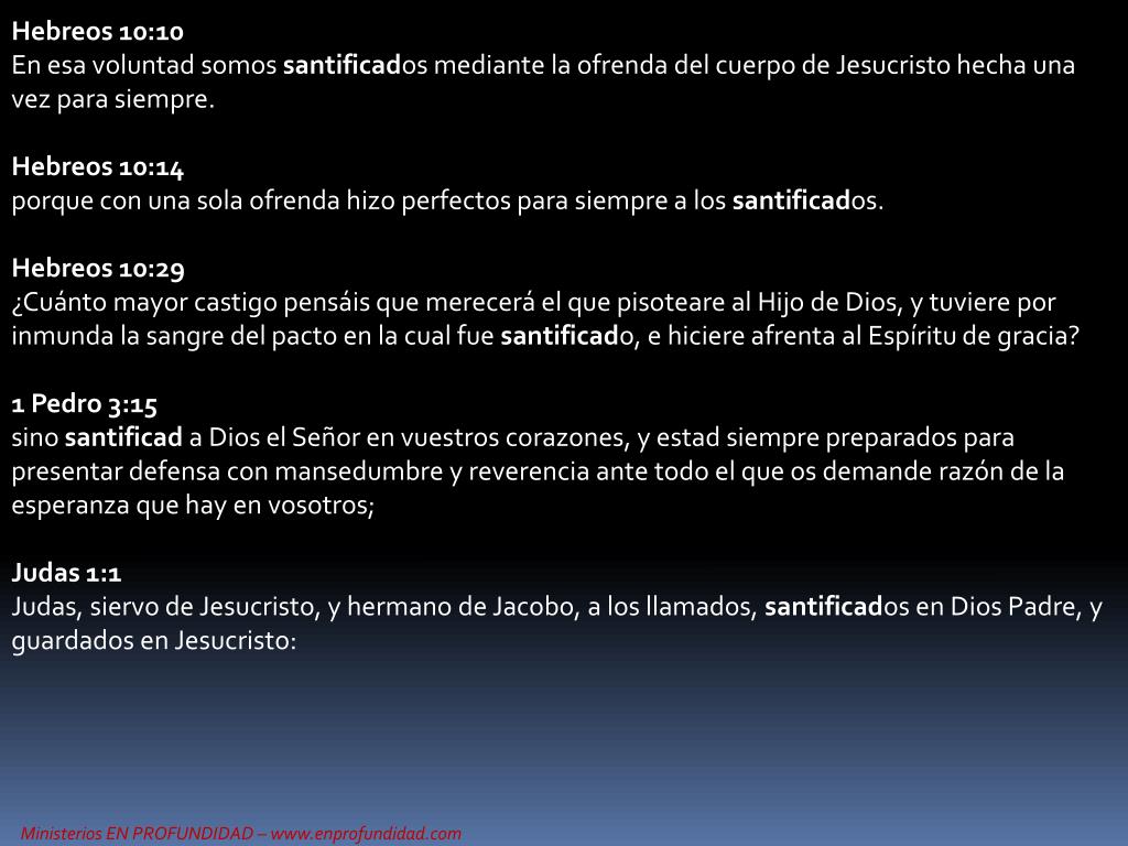 Hebreos 10:10En esa voluntad somos santificados mediante la ofrenda del cuerpo de Jesucristo hecha una vez para siempre. Hebreos 10:14porque con una sola ofrenda hizo perfectos para siempre a los santificados. Hebreos 10:29¿Cuánto mayor castigo pensáis que merecerá el que pisoteare al Hijo de Dios, y tuviere por inmunda la sangre del pacto en la cual fue santificado, e hiciere afrenta al Espíritu de gracia? 1 Pedro 3:15sino santificad a Dios el Señor en vuestros corazones, y estad siempre preparados para presentar defensa con mansedumbre y reverencia ante todo el que os demande razón de la esperanza que hay en vosotros; Judas 1:1Judas, siervo de Jesucristo, y hermano de Jacobo, a los llamados, santificados en Dios Padre, y guardados en Jesucristo: