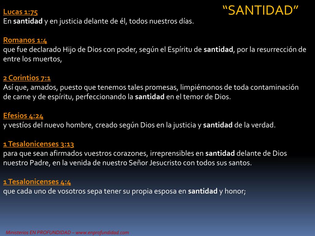 “SANTIDAD” Lucas 1:75En santidad y en justicia delante de él, todos nuestros días. Romanos 1:4que fue declarado Hijo de Dios con poder, según el Espíritu de santidad, por la resurrección de entre los muertos, 2 Corintios 7:1Así que, amados, puesto que tenemos tales promesas, limpiémonos de toda contaminación de carne y de espíritu, perfeccionando la santidad en el temor de Dios. Efesios 4:24y vestíos del nuevo hombre, creado según Dios en la justicia y santidad de la verdad. 1 Tesalonicenses 3:13para que sean afirmados vuestros corazones, irreprensibles en santidad delante de Dios nuestro Padre, en la venida de nuestro Señor Jesucristo con todos sus santos. 1 Tesalonicenses 4:4que cada uno de vosotros sepa tener su propia esposa en santidad y honor;