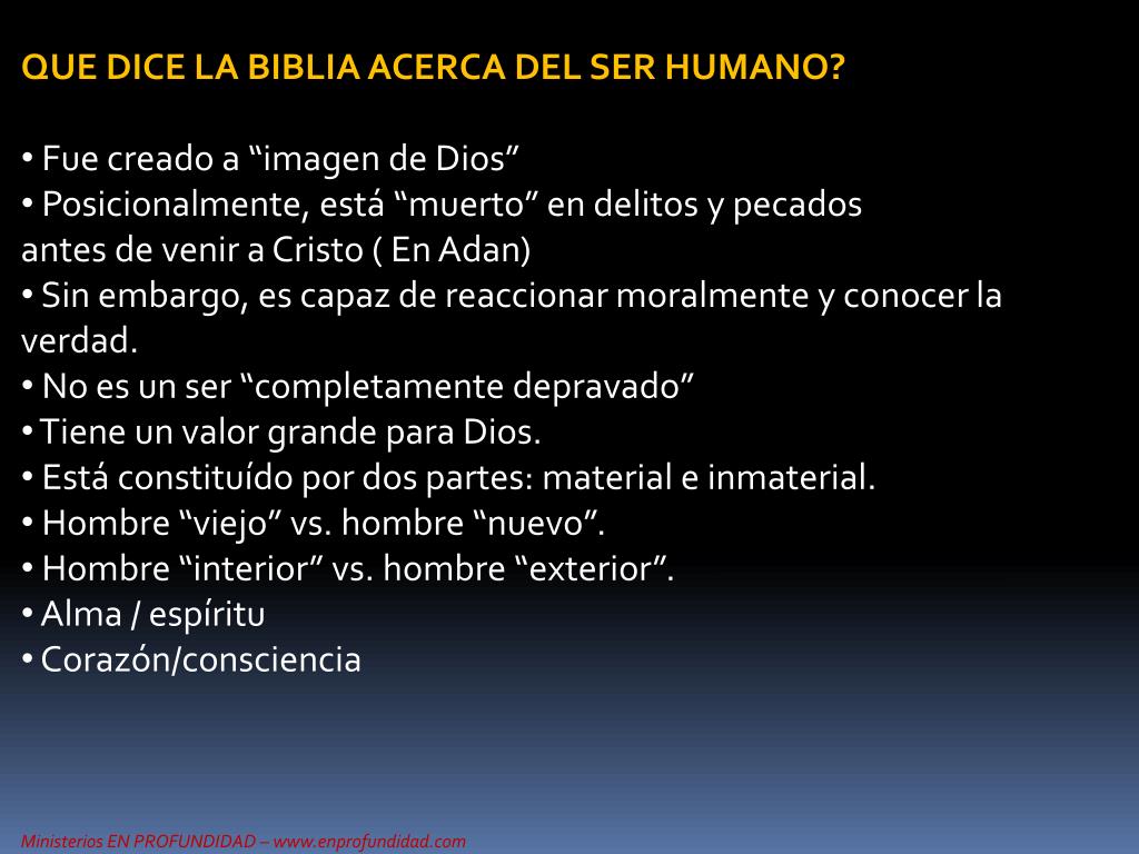 QUE DICE LA BIBLIA ACERCA DEL SER HUMANO? • Fue creado a “imagen de Dios” • Posicionalmente, está “muerto” en delitos y pecados antes de venir a Cristo ( En Adan) • Sin embargo, es capaz de reaccionar moralmente y conocer la verdad. • No es un ser “completamente depravado” • Tiene un valor grande para Dios. • Está constituído por dos partes: material e inmaterial. • Hombre “viejo” vs. hombre “nuevo”. • Hombre “interior” vs. hombre “exterior”. • Alma / espíritu • Corazón/consciencia