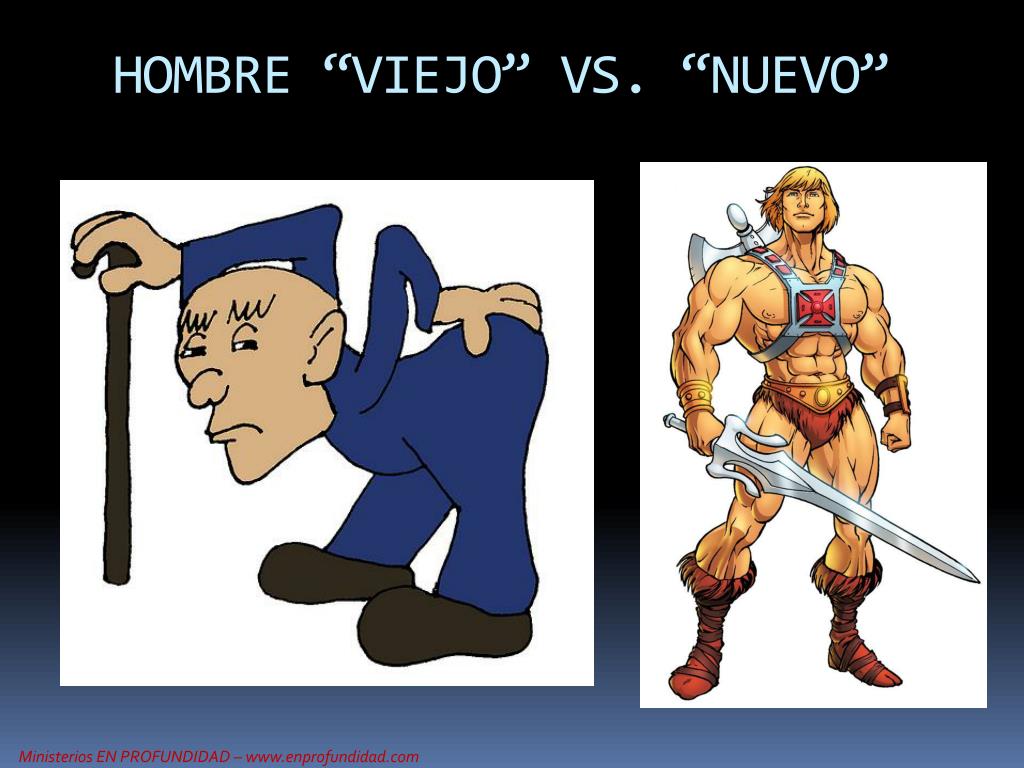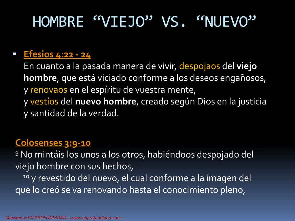 HOMBRE “VIEJO” VS. “NUEVO” • Efesios 4:22 - 24En cuanto a la pasada manera de vivir, despojaos del viejohombre, que está viciado conforme a los deseos engañosos, y renovaos en el espíritu de vuestra mente, y vestíos del nuevohombre, creado según Dios en la justicia y santidad de la verdad. Colosenses 3:9-10 9 No mintáis los unos a los otros, habiéndoos despojado del viejo hombre con sus hechos, 10 y revestido del nuevo, el cual conforme a la imagen del que lo creó se va renovando hasta el conocimiento pleno,