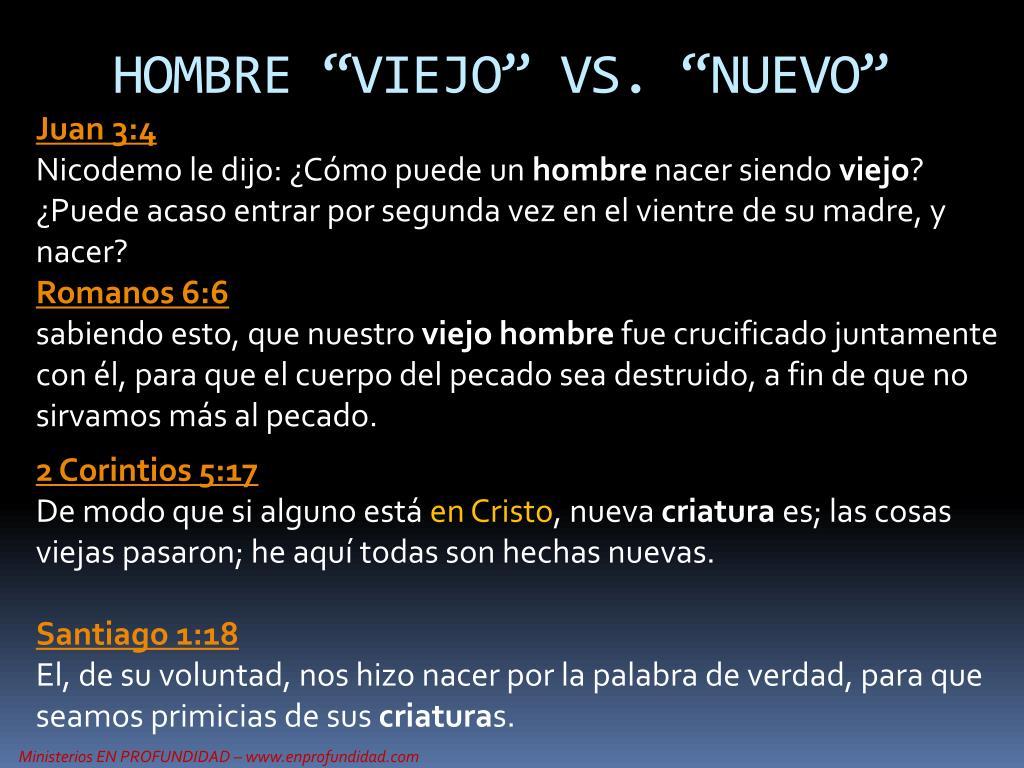 HOMBRE “VIEJO” VS. “NUEVO” Juan 3:4Nicodemo le dijo: ¿Cómo puede un hombre nacer siendo viejo? ¿Puede acaso entrar por segunda vez en el vientre de su madre, y nacer?Romanos 6:6sabiendo esto, que nuestro viejohombre fue crucificado juntamente con él, para que el cuerpo del pecado sea destruido, a fin de que no sirvamos más al pecado. 2 Corintios 5:17De modo que si alguno está en Cristo, nueva criatura es; las cosas viejas pasaron; he aquí todas son hechas nuevas. Santiago 1:18El, de su voluntad, nos hizo nacer por la palabra de verdad, para que seamos primicias de sus criaturas.