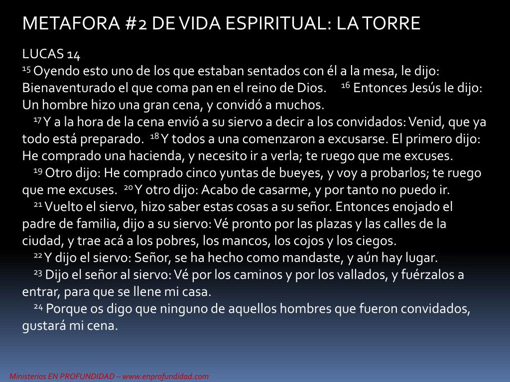 METAFORA #2 DE VIDA ESPIRITUAL: LA TORRE LUCAS 14 15 Oyendo esto uno de los que estaban sentados con él a la mesa, le dijo: Bienaventurado el que coma pan en el reino de Dios. 16 Entonces Jesús le dijo: Un hombre hizo una gran cena, y convidó a muchos. 17 Y a la hora de la cena envió a su siervo a decir a los convidados: Venid, que ya todo está preparado. 18 Y todos a una comenzaron a excusarse. El primero dijo: He comprado una hacienda, y necesito ir a verla; te ruego que me excuses. 19 Otro dijo: He comprado cinco yuntas de bueyes, y voy a probarlos; te ruego que me excuses. 20 Y otro dijo: Acabo de casarme, y por tanto no puedo ir. 21 Vuelto el siervo, hizo saber estas cosas a su señor. Entonces enojado el padre de familia, dijo a su siervo: Vé pronto por las plazas y las calles de la ciudad, y trae acá a los pobres, los mancos, los cojos y los ciegos. 22 Y dijo el siervo: Señor, se ha hecho como mandaste, y aún hay lugar. 23 Dijo el señor al siervo: Vé por los caminos y por los vallados, y fuérzalos a entrar, para que se llene mi casa. 24 Porque os digo que ninguno de aquellos hombres que fueron convidados, gustará mi cena.