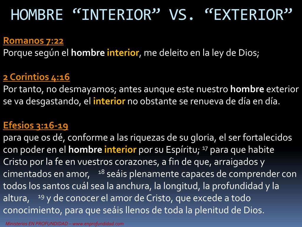 HOMBRE “INTERIOR” VS. “EXTERIOR” Romanos 7:22Porque según el hombreinterior, me deleito en la ley de Dios; 2 Corintios 4:16Por tanto, no desmayamos; antes aunque este nuestro hombre exterior se va desgastando, el interior no obstante se renueva de día en día. Efesios 3:16-19para que os dé, conforme a las riquezas de su gloria, el ser fortalecidos con poder en el hombreinterior por su Espíritu; 17 para que habite Cristo por la fe en vuestros corazones, a fin de que, arraigados y cimentados en amor, 18 seáis plenamente capaces de comprender con todos los santos cuál sea la anchura, la longitud, la profundidad y la altura, 19 y de conocer el amor de Cristo, que excede a todo conocimiento, para que seáis llenos de toda la plenitud de Dios.