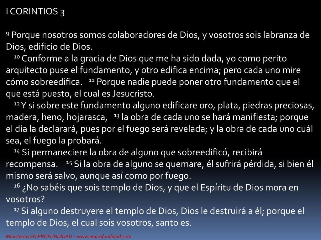I CORINTIOS 3 9 Porque nosotros somos colaboradores de Dios, y vosotros sois labranza de Dios, edificio de Dios. 10 Conforme a la gracia de Dios que me ha sido dada, yo como perito arquitecto puse el fundamento, y otro edifica encima; pero cada uno mire cómo sobreedifica. 11 Porque nadie puede poner otro fundamento que el que está puesto, el cual es Jesucristo. 12 Y si sobre este fundamento alguno edificare oro, plata, piedras preciosas, madera, heno, hojarasca, 13 la obra de cada uno se hará manifiesta; porque el día la declarará, pues por el fuego será revelada; y la obra de cada uno cuál sea, el fuego la probará. 14 Si permaneciere la obra de alguno que sobreedificó, recibirá recompensa. 15 Si la obra de alguno se quemare, él sufrirá pérdida, si bien él mismo será salvo, aunque así como por fuego. 16 ¿No sabéis que sois templo de Dios, y que el Espíritu de Dios mora en vosotros? 17 Si alguno destruyere el templo de Dios, Dios le destruirá a él; porque el templo de Dios, el cual sois vosotros, santo es.