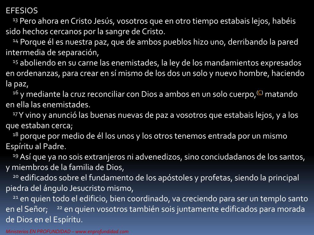 EFESIOS 13 Pero ahora en Cristo Jesús, vosotros que en otro tiempo estabais lejos, habéis sido hechos cercanos por la sangre de Cristo. 14 Porque él es nuestra paz, que de ambos pueblos hizo uno, derribando la pared intermedia de separación, 15 aboliendo en su carne las enemistades, la ley de los mandamientos expresados en ordenanzas, para crear en sí mismo de los dos un solo y nuevo hombre, haciendo la paz, 16 y mediante la cruz reconciliar con Dios a ambos en un solo cuerpo,(C) matando en ella las enemistades. 17 Y vino y anunció las buenas nuevas de paz a vosotros que estabais lejos, y a los que estaban cerca; 18 porque por medio de él los unos y los otros tenemos entrada por un mismo Espíritu al Padre. 19 Así que ya no sois extranjeros ni advenedizos, sino conciudadanos de los santos, y miembros de la familia de Dios, 20 edificados sobre el fundamento de los apóstoles y profetas, siendo la principal piedra del ángulo Jesucristo mismo, 21 en quien todo el edificio, bien coordinado, va creciendo para ser un templo santo en el Señor; 22 en quien vosotros también sois juntamente edificados para morada de Dios en el Espíritu.