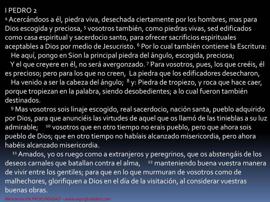 I PEDRO 2 4 Acercándoos a él, piedra viva, desechada ciertamente por los hombres, mas para Dios escogida y preciosa, 5 vosotros también, como piedras vivas, sed edificados como casa espiritual y sacerdocio santo, para ofrecer sacrificios espirituales aceptables a Dios por medio de Jesucristo. 6 Por lo cual también contiene la Escritura: He aquí, pongo en Sion la principal piedra del ángulo, escogida, preciosa; Y el que creyere en él, no será avergonzado. 7 Para vosotros, pues, los que creéis, él es precioso; pero para los que no creen, La piedra que los edificadores desecharon, Ha venido a ser la cabeza del ángulo; 8 y: Piedra de tropiezo, y roca que hace caer, porque tropiezan en la palabra, siendo desobedientes; a lo cual fueron también destinados. 9 Mas vosotros sois linaje escogido, real sacerdocio, nación santa, pueblo adquirido por Dios, para que anunciéis las virtudes de aquel que os llamó de las tinieblas a su luz admirable; 10 vosotros que en otro tiempo no erais pueblo, pero que ahora sois pueblo de Dios; que en otro tiempo no habíais alcanzado misericordia, pero ahora habéis alcanzado misericordia. 11 Amados, yo os ruego como a extranjeros y peregrinos, que os abstengáis de los deseos carnales que batallan contra el alma, 12 manteniendo buena vuestra manera de vivir entre los gentiles; para que en lo que murmuran de vosotros como de malhechores, glorifiquen a Dios en el día de la visitación, al considerar vuestras buenas obras.
