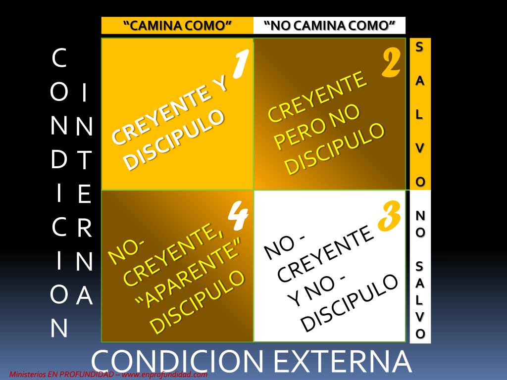 “CAMINA COMO” “NO CAMINA COMO” 2 1 CONDI C ION S A L V O IN T ERNA CREYENTE PERO NO DISCIPULO CREYENTE Y DISCIPULO 4 3 NO SALVO NO-CREYENTE, “APARENTE” DISCIPULO NO -CREYENTE Y NO -DISCIPULO CONDICION EXTERNA