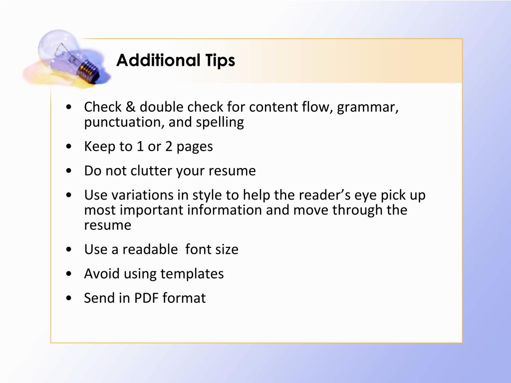 Additional Tips • Check & double check for content flow, grammar, punctuation, and spelling • Keep to 1 or 2 pages • Do not clutter your resume • Use variations in style to help the reader’s eye pick up most important information and move through the resume • Use a readable font size • Avoid using templates • Send in PDF format