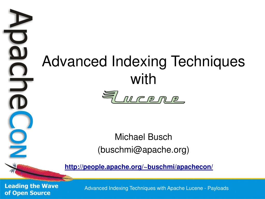 Advanced Indexing Techniques with Michael Busch (buschmi@apache.org) http://people.apache.org/~buschmi/apachecon/ Advanced Indexing Techniques with Apache Lucene - Payloads