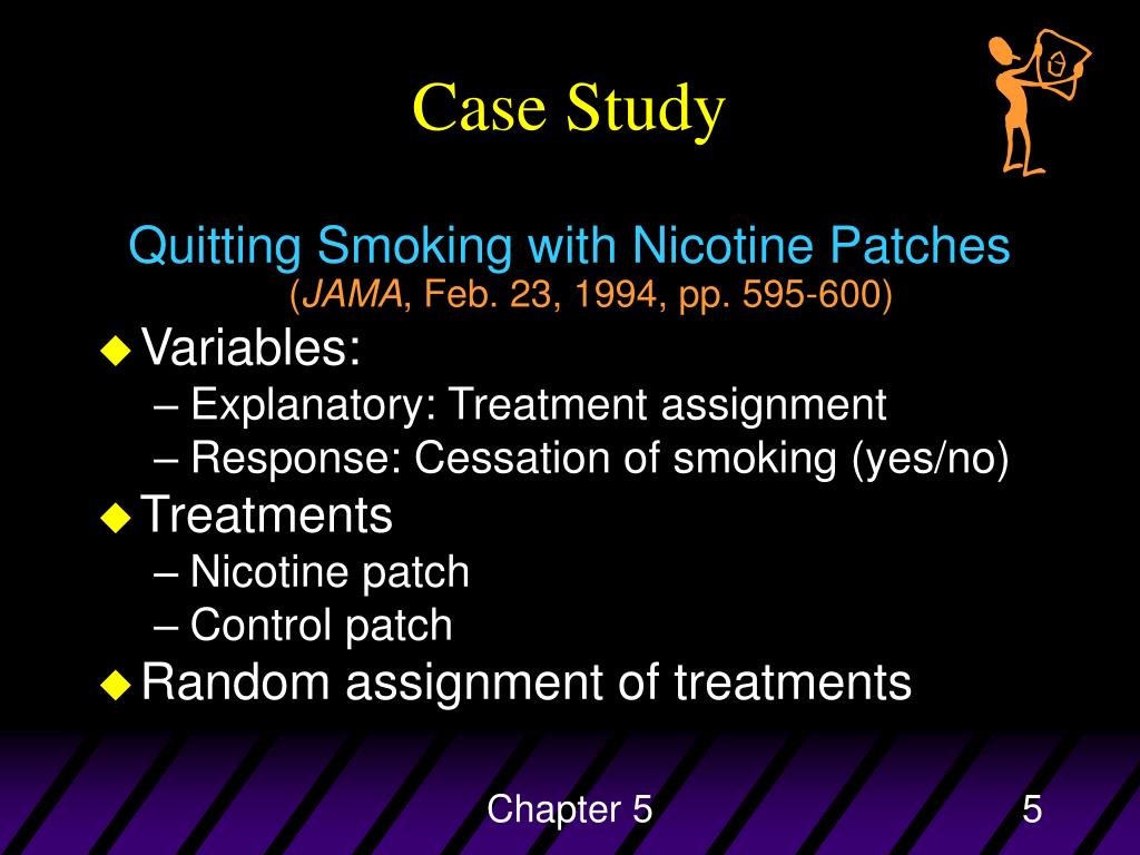 Case Study • Quitting Smoking with Nicotine Patches (JAMA, Feb. 23, 1994, pp. 595-600) • Variables: • Explanatory: Treatment assignment • Response: Cessation of smoking (yes/no) • Treatments • Nicotine patch • Control patch • Random assignment of treatments Chapter 5