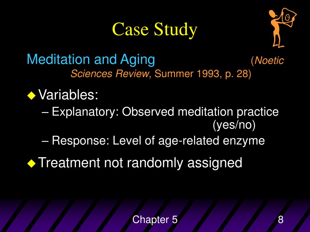 Case Study • Meditation and Aging (Noetic Sciences Review, Summer 1993, p. 28) • Variables: • Explanatory: Observed meditation practice (yes/no) • Response: Level of age-related enzyme • Treatment not randomly assigned Chapter 5
