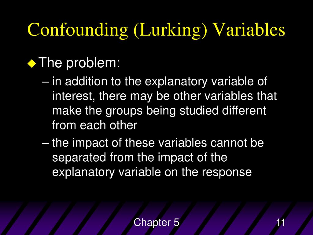 Confounding (Lurking) Variables • The problem: • in addition to the explanatory variable of interest, there may be other variables that make the groups being studied different from each other • the impact of these variables cannot be separated from the impact of the explanatory variable on the response Chapter 5