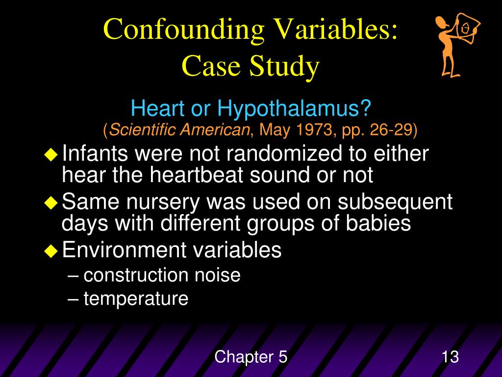 Confounding Variables:Case Study • Heart or Hypothalamus? (Scientific American, May 1973, pp. 26-29) • Infants were not randomized to either hear the heartbeat sound or not • Same nursery was used on subsequent days with different groups of babies • Environment variables • construction noise • temperature Chapter 5