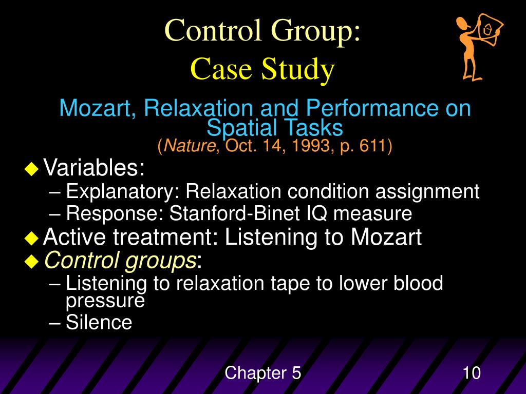 Control Group:Case Study • Mozart, Relaxation and Performance on Spatial Tasks (Nature, Oct. 14, 1993, p. 611) • Variables: • Explanatory: Relaxation condition assignment • Response: Stanford-Binet IQ measure • Active treatment: Listening to Mozart • Control groups: • Listening to relaxation tape to lower blood pressure • Silence Chapter 5