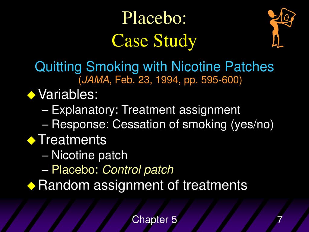 Placebo:Case Study • Quitting Smoking with Nicotine Patches (JAMA, Feb. 23, 1994, pp. 595-600) • Variables: • Explanatory: Treatment assignment • Response: Cessation of smoking (yes/no) • Treatments • Nicotine patch • Placebo: Control patch • Random assignment of treatments Chapter 5