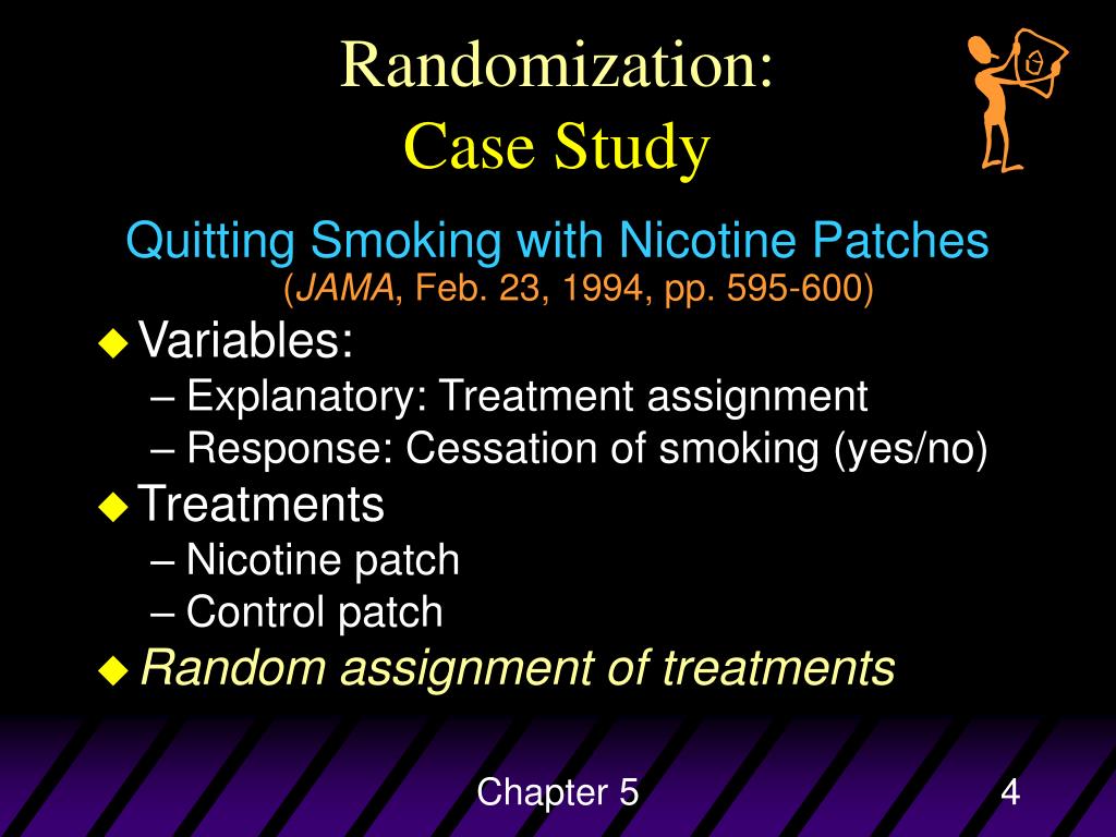 Randomization:Case Study • Quitting Smoking with Nicotine Patches (JAMA, Feb. 23, 1994, pp. 595-600) • Variables: • Explanatory: Treatment assignment • Response: Cessation of smoking (yes/no) • Treatments • Nicotine patch • Control patch • Random assignment of treatments Chapter 5