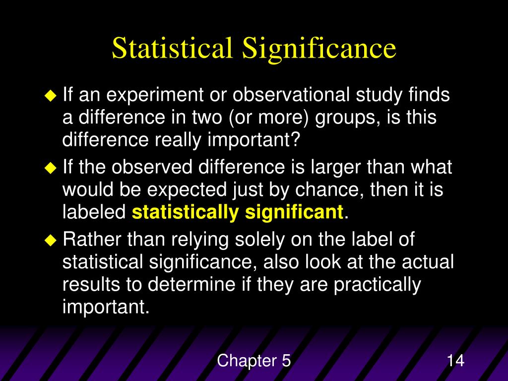 Statistical Significance • If an experiment or observational study finds a difference in two (or more) groups, is this difference really important? • If the observed difference is larger than what would be expected just by chance, then it is labeled statistically significant. • Rather than relying solely on the label of statistical significance, also look at the actual results to determine if they are practically important. Chapter 5