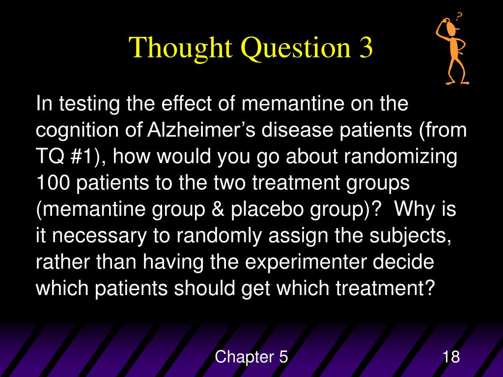 Thought Question 3 In testing the effect of memantine on the cognition of Alzheimer’s disease patients (from TQ #1), how would you go about randomizing 100 patients to the two treatment groups (memantine group & placebo group)? Why is it necessary to randomly assign the subjects, rather than having the experimenter decide which patients should get which treatment? Chapter 5