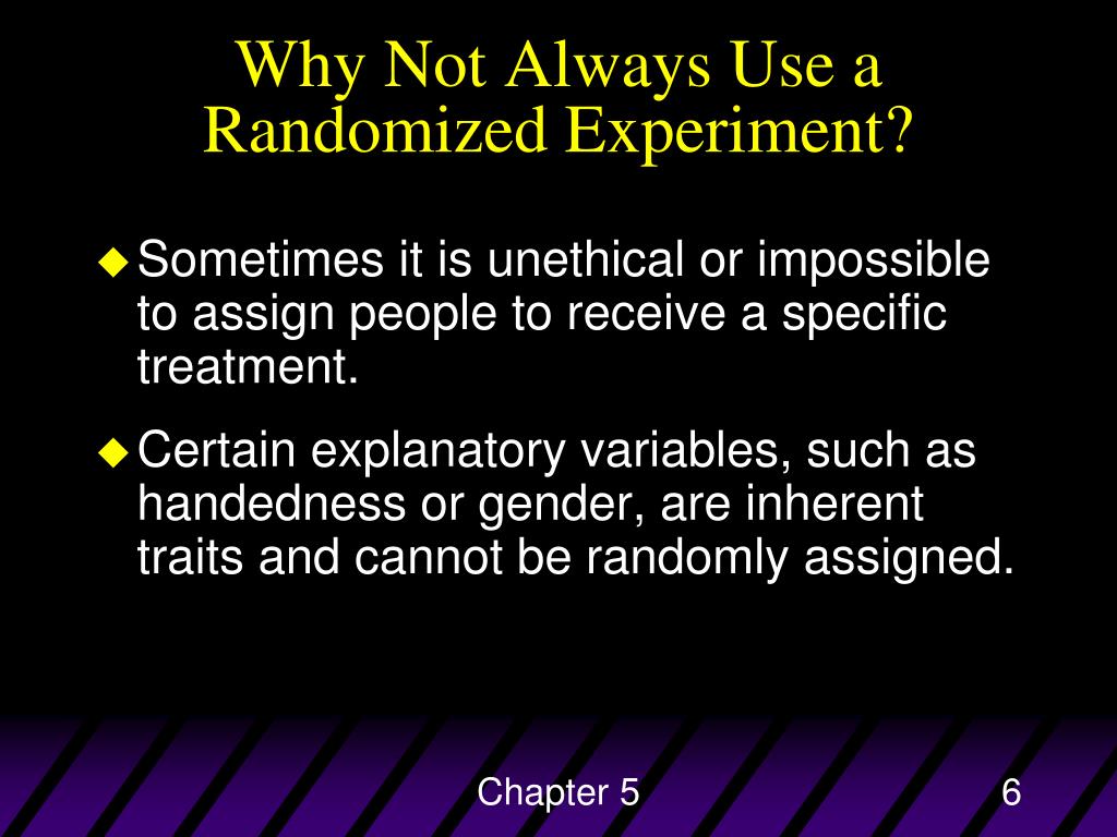 Why Not Always Use a Randomized Experiment? • Sometimes it is unethical or impossible to assign people to receive a specific treatment. • Certain explanatory variables, such as handedness or gender, are inherent traits and cannot be randomly assigned. Chapter 5