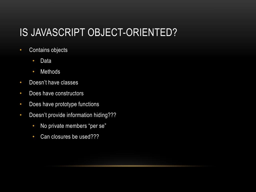 Is JavaScript Object-Oriented? • Contains objects • Data • Methods • Doesn’t have classes • Does have constructors • Does have prototype functions • Doesn’t provide information hiding??? • No private members “per se” • Can closures be used???